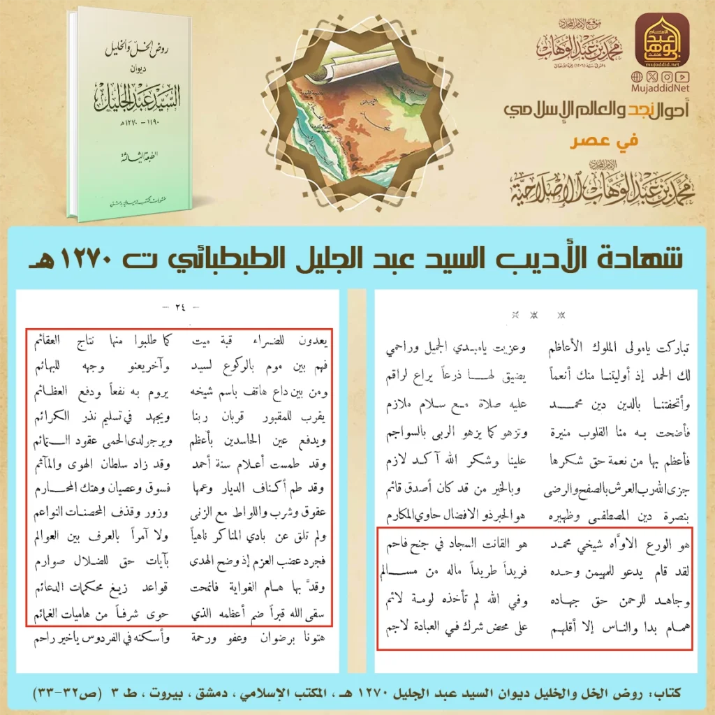 كتاب : روض الخل والخليل ديوان السيد عبد الجليل ۱۲۷۰ هـ ، المكتب الإسلامي ، دمشق ، بيروت ، ط ۳ (ص۳۲-۳۳)